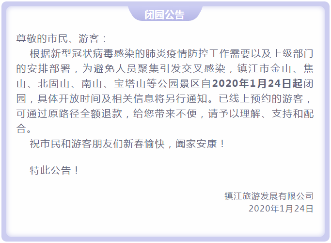 关于镇江市区五山公园景区闭园暂停游客接待的公告