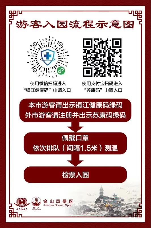五、入园须知 1.为确保游客安全,所有人员入园时请自觉佩戴口罩。本市游客需出示“镇江健康码”绿码、外市游客请注册并出示苏康码绿码,经测温正常后实行身份证实名制登记入园。如发现体温异常情况禁止入园,并敬请配合景区工作人员进行疫情隔离工作。 2.持镇江旅游年卡及符合免票政策的游客及市民,需同时凭身份证及各类优惠证件入园。 3.当入园人数接近单日最大承载量、最大瞬时客流量的30%时(金山景区单日最大承载量40000人、最大瞬时客流量25000人),景区将采取阶段性停止售检票和分时放行等限流措施。 六、游览须知 1.请游客遵守文明旅游公约,入园游览期间全程佩戴口罩,并自觉与他人保持距离,分散、有序游览。 2.在疫情全面解除之前,景区室外开放区域不得开展任何人员聚集性活动,一经发现,工作人员将予以劝阻。 3.为感谢在新冠肺炎疫情中守护健康、捍卫生命的医护工作者,金山景区自恢复开园之日起至2020年12月31日,向全国医护人员,免费开放! (持本人的有效身份证及工作证件)