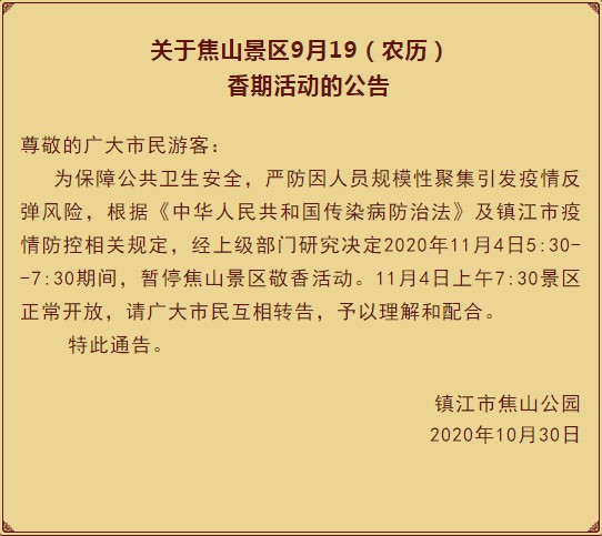 关于焦山景区9月19(农历) 香期活动的公告