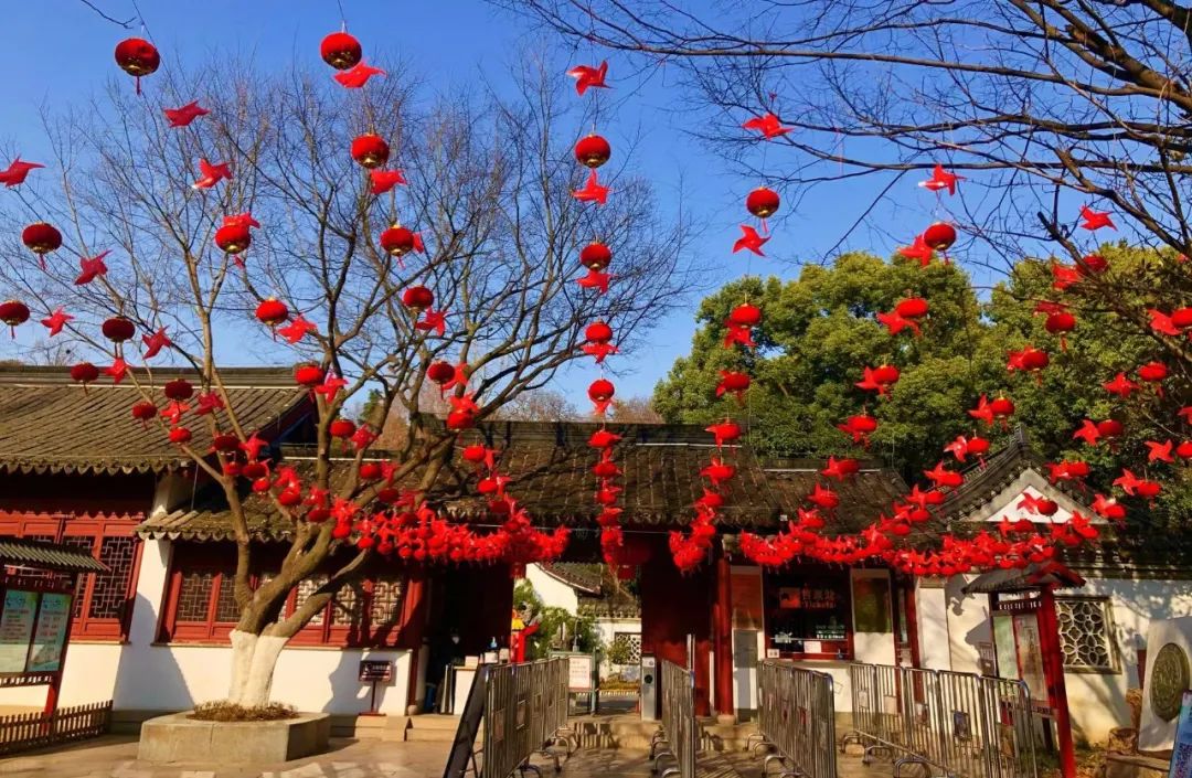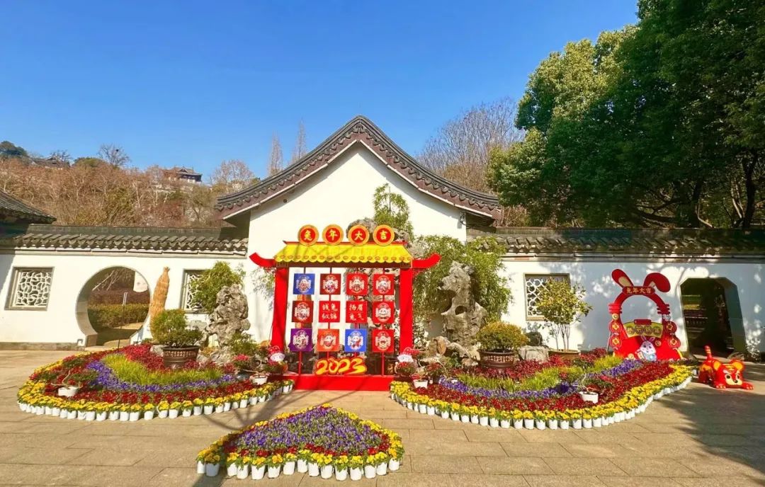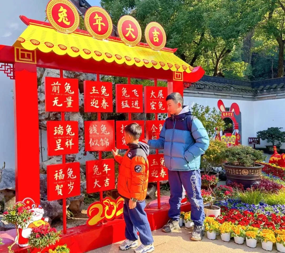 挂灯笼、贴窗花,火红的氛围,瞬间点燃了春节的气息 景区主入口、牌坊等处设置“兔来运转”、“福兔贺岁”等主题造型和“兔年大吉”打卡点,搭配红色、黄色、紫色等各色时令花卉,增添浓浓年味,欢迎游客前来打卡!