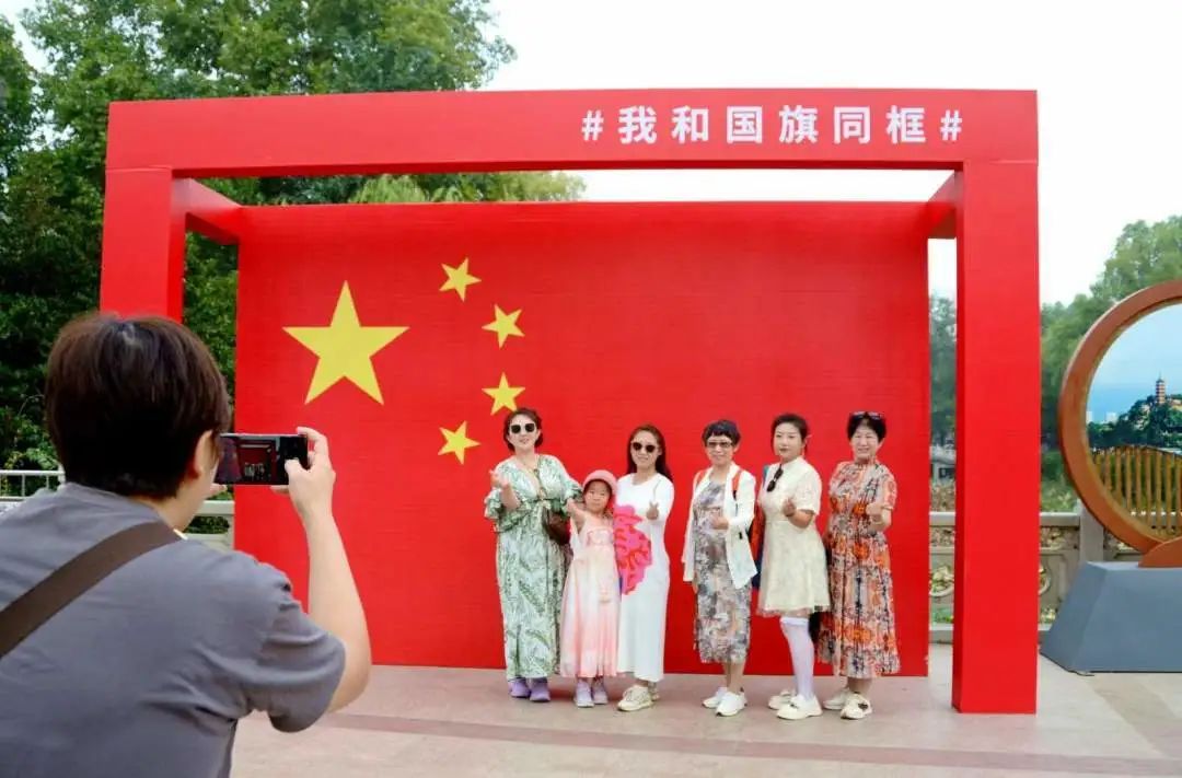 迎风招展的五星红旗,在阳光下显得格外鲜艳,一抹抹绚丽的“中国红”, 不仅给游客营造喜庆祥和的节日氛围,更表达对祖国未来更加繁荣昌盛的美好祝愿。