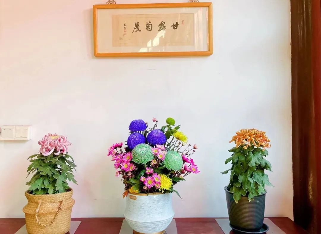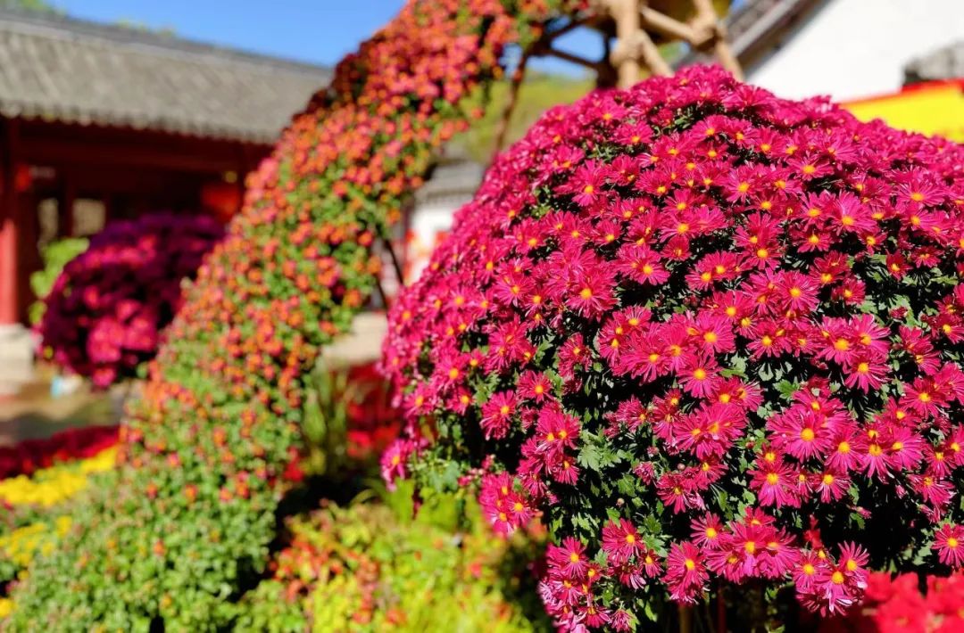 景区主入口及主干道两侧,以立菊、盆景菊、悬崖菊、棒棒糖等造型菊,搭配各类小品和鲜花,通过精心设计布局, 充分展示菊花的五彩缤纷和千姿百态,营造出“花瀑流霞 菊韵清秋”的沉浸式赏菊意境。
