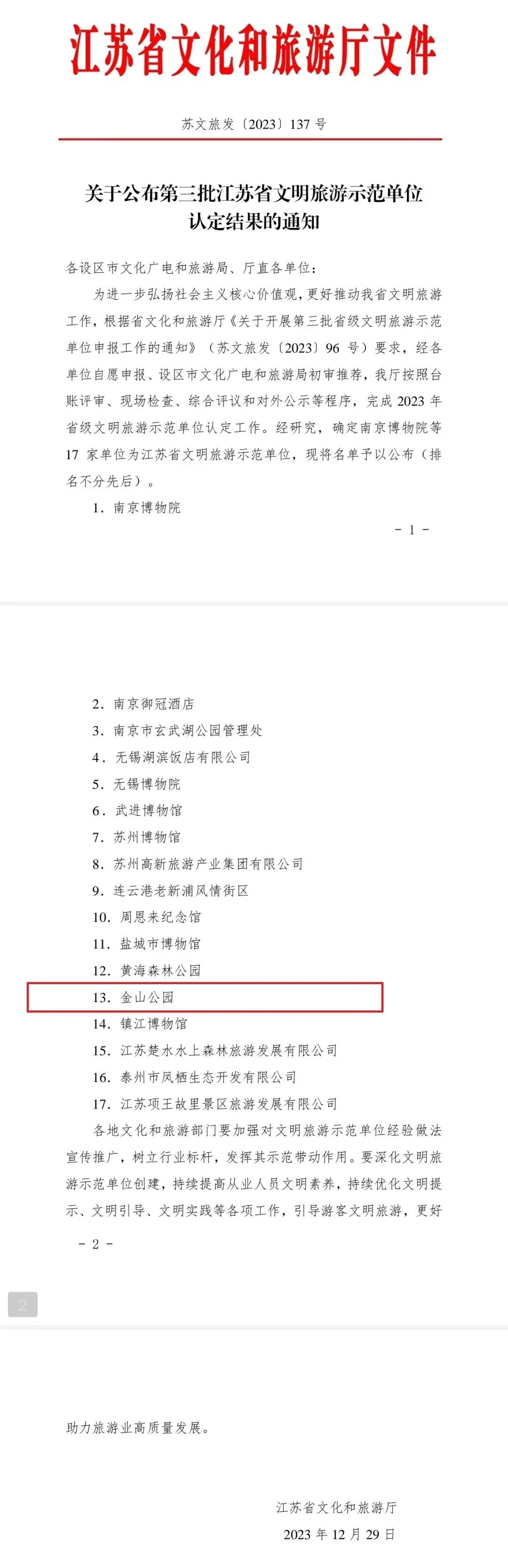 近日,江苏省文化和旅游厅公布了2023年省级文明旅游示范单位名单,镇江金山公园入选。