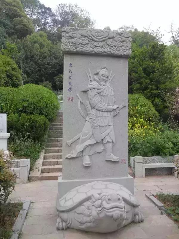 北固山下,是三国东吴大将太史慈墓。墓前有座画像碑,是据史书上描写勾画出太史慈的轮廓:“身材高大,长有“美须髯”,猿臂善射弦不虚发。背插双戟,手按三尺长剑。”